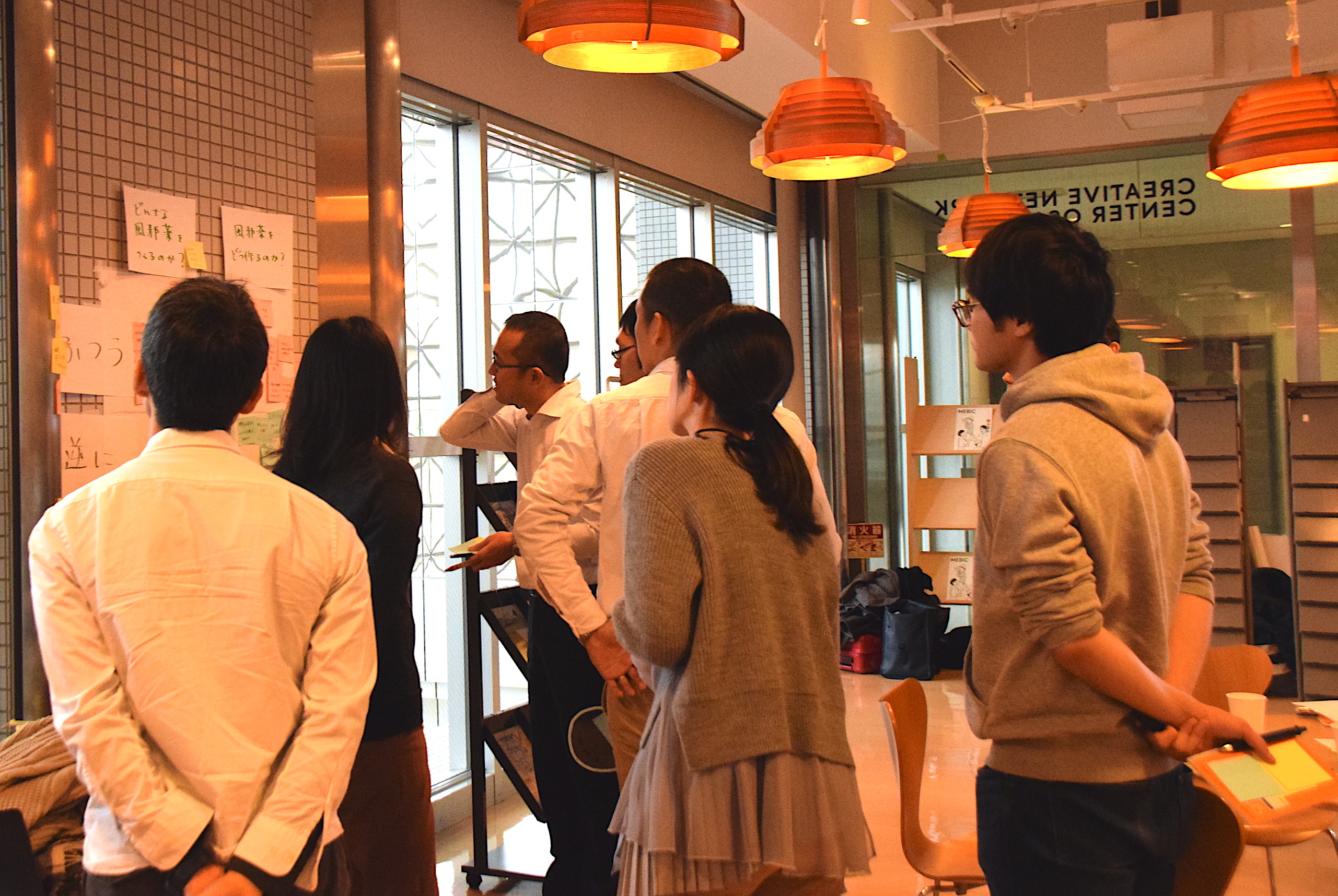プロジェクトの後半では、「基礎研究から臨床研究、実際の治療までを医者と患者が一体となり行う架空の施設をつくるとしたら、どのようなプロセスを構築するか?」というテーマを切り口に、既存の業務では接点のないセクションの人との関わり合いをデザインするワークを実施しました。これまで体験してきたワークショップの技法の根底にある哲学や思想、姿勢を創薬プロセスに取り入れるイメージを膨らませていくことで、日々の業務において創造的コラボレーションを起こす方法を探っていきました。