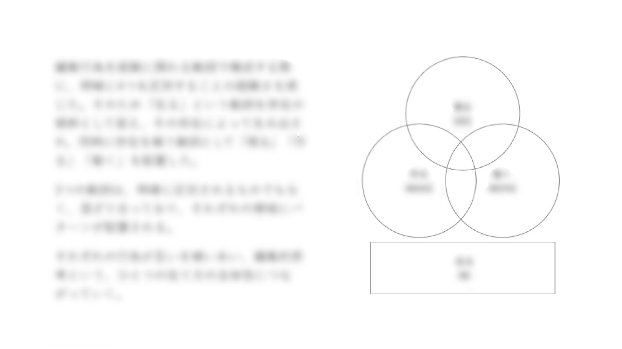 プロジェクトを通して得られた編集にまつわる様々な「知」を、最終的にパターン・ランゲージの形式にまとめました。パターン・ランゲージは「状況」「問題」「解決」の3つの項目から構成される、対象領域の暗黙知を言語化し共有可能な形とする手法です。「編集思考」を持つプロフェッショナルたちの視点や考え方を行動レベルでまとめ、日常的な実践の中に「編集思考」を見出すことを支援するため、構造化と言語化を行いました。