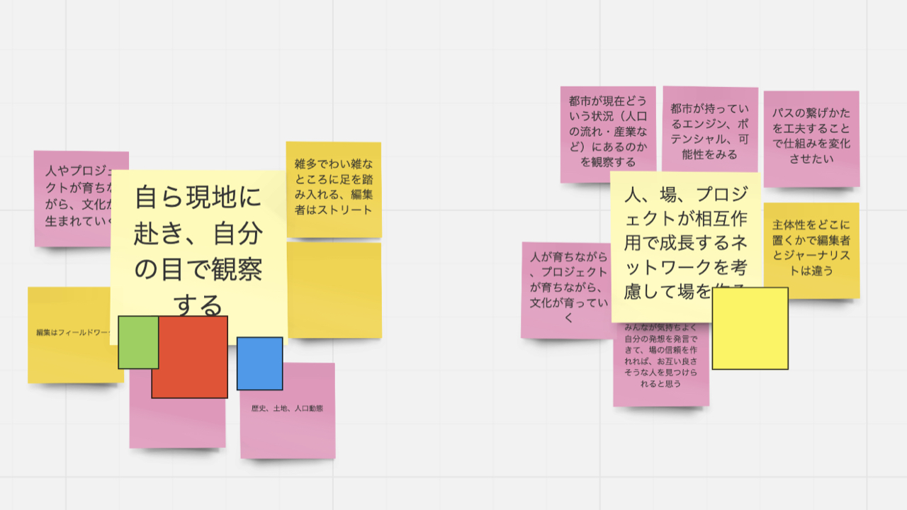 インタビュー調査の後には、専門書や関連書籍の文献リサーチおよびデスクトップリサーチで得られた知見を収集し、インタビューで得られた情報と統合した上で、コーディングを行いました。コーディングの結果をもとにカテゴリ生成を行い、「編集」に取り組むプロフェッショナルが共通して大事にしていた価値観や思考体系を「編集思考」のパターンとして抽出していきました。