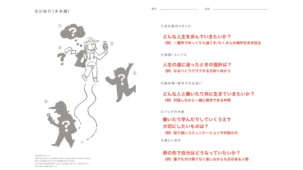 これから社会がますます不確実性を増していく中では、プラン通りに決められた目的地に向かう「旅行」ではなく、たとえ途中で目的を見失ったとしても、自身の衝動に基づいて新たな行き先を選んでいく「旅」をするような姿勢で臨むことが重要です。そうした前提のもと、自分自身のキャリアという「旅」について、「1人旅なのか、気を許した友人との2人旅か」や「どのような旅にしたいか」、「起こりうるトラブルをどう乗り越えていくのか」などの問いを通じて、理解を深めていきました。