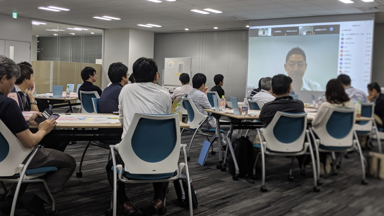 本プログラムは、国内だけでなく海外で勤務する社員も対象としていました。そこで、各ワークショップの際には、国内外の会場の様子を同時中継しながらワークに取り組んでもらい、国境を超えたファシリテーションを実施。また、チャットツールを用いた専用のコミュニケーションスペースを用意し、ワークショップ中だけでなく、日常においても、参加者間で交流し、刺激し合いながら、ビジネスモデルを磨いていける設計を施しました。