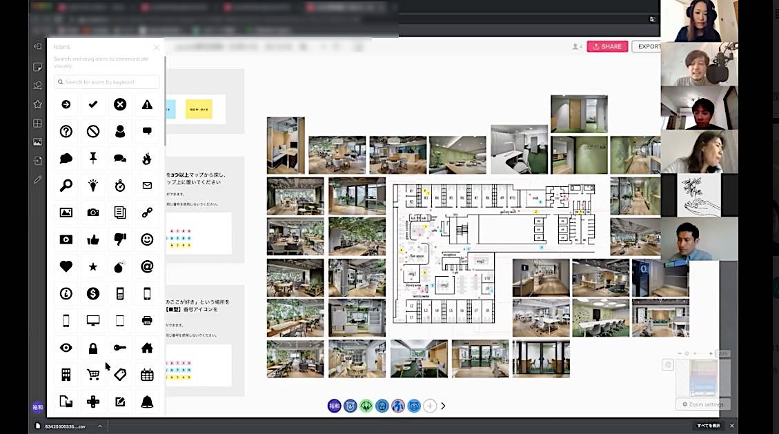 全3回中、第1回と第2回ワークショップはオンライン上で実施しました。第1回では、まず参加者がpoint 0という空間で過ごす中で創造的な自分やチームを実際に体感したシーンを共有したのち、point 0で過ごす日のタイムラインを書き出し、その中で創造的だと感じたシーンを抽出するワークを通じて、point 0における創造性のイメージを明確にしていきました。第2回では、point 0が持つ多様性の側面に目を向け、空間としてどのような多様性を許容しているのか、その結果、人々の感覚や認識、関係、行動がどのように多様化しているのかをマッピングし、可視化するワークを行いました。